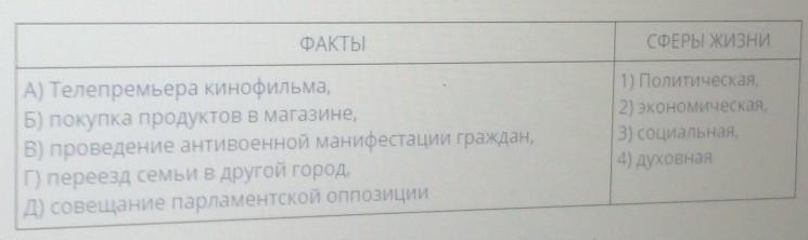 Установите соответствие между фактами и сферами общества жизни: к какому элементу, данному в первом столбце, подберите соответствующий элемент из второго столбца. Внимание!! Цифры могут повторяться или могут остаться лишними.