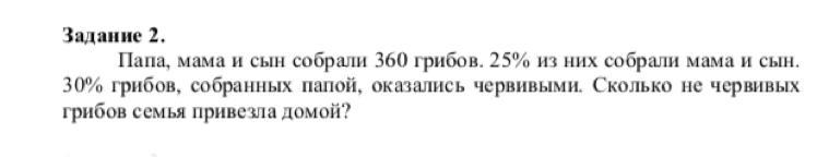 Папа, мама и сын собрали 360 грибов. 25% из них собрали мама и сын. 30% грибов, собранных папой, оказались червивыми. Сколько не червивых грибов семья привезла домой?