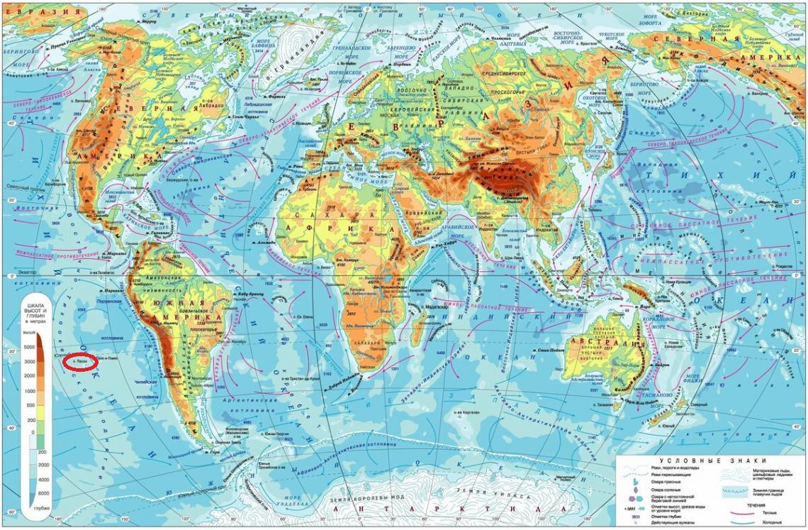 Если мы посмотрим на карту, данную ниже, то увидим, что о.Пасхи имеет координаты 26° ю.ш., 108° з.д.