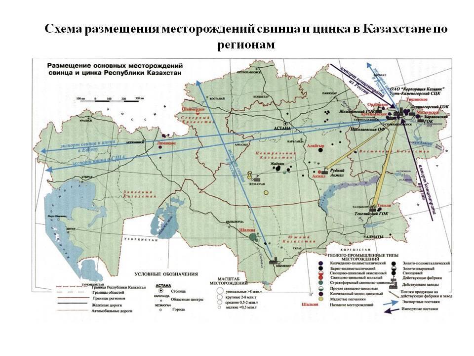 Как видно из карты, которая дана ниже в приложении, месторождения цинка есть в Восточно-Казахстанской области, Карагандинской и Кызылординской.