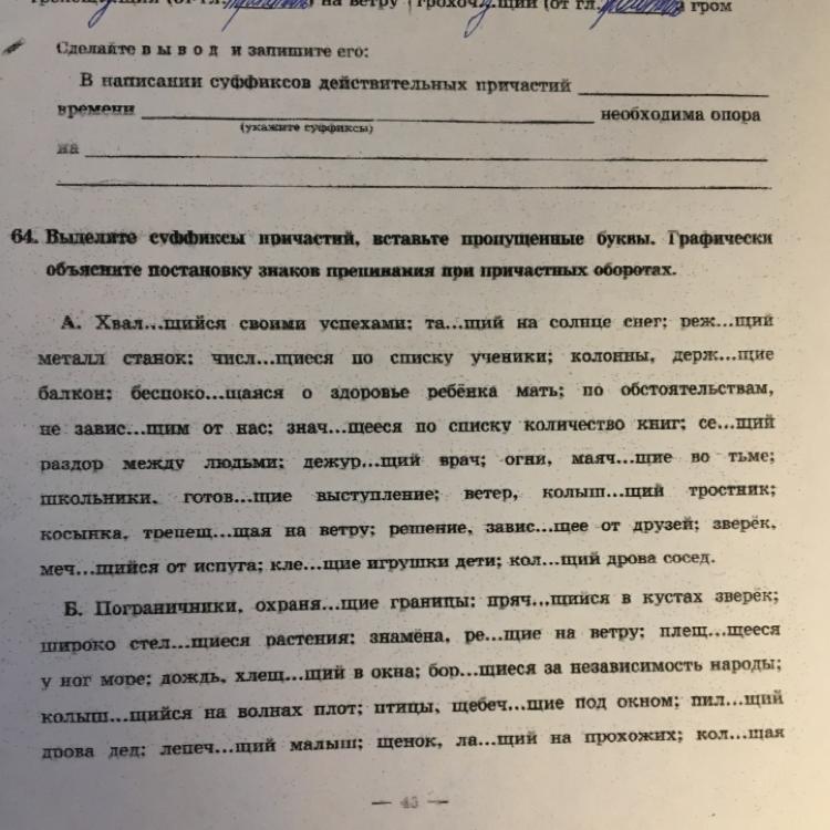 А: хвалЯщийся своими успехами, таЮщий на солнце снег, режУщий металл станок, числЯщиеся по списку ученики, колонны, держАщие балкон, беспокоЯщаяся о здоровье ребёнка мать, по обстоятельствам, не зависЯщим от нас, значАщееся по списку количество книг, сеЮщий раздор между людьми, дежурЯщий врач, огни, маячАщие во тьме, школьники, готовЯщие выступление, ветер, колышУщий тростник, косынка, трепещУщая на ветру, решение, зависЯщее от друзей, зверёк, мечущИйся от испуга, клеЯщие игрушки дети, колЮщий дрова сосед.