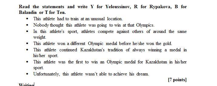 Read the statements and write Y for Yeleussinov, R for Rypakova, B for Balandin or T for Ten.