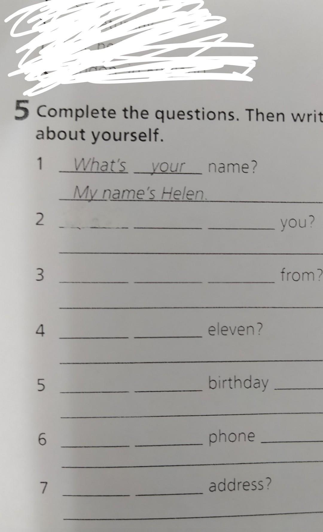 2. How old are you? I am (твой возраст) years old. 3.Where are you from? I am from (твой город). 4. Are you eleven? Yes, I am (если тебе 11 лет) или No I`m not (если тебе не 11). 5. What`s your birthday date? My birthday date is (дата твоего рождения). 6. What`s your phone number? My phone number is (твой номер телефона). 7. What`s your adress? My adress is (твой адресс)
