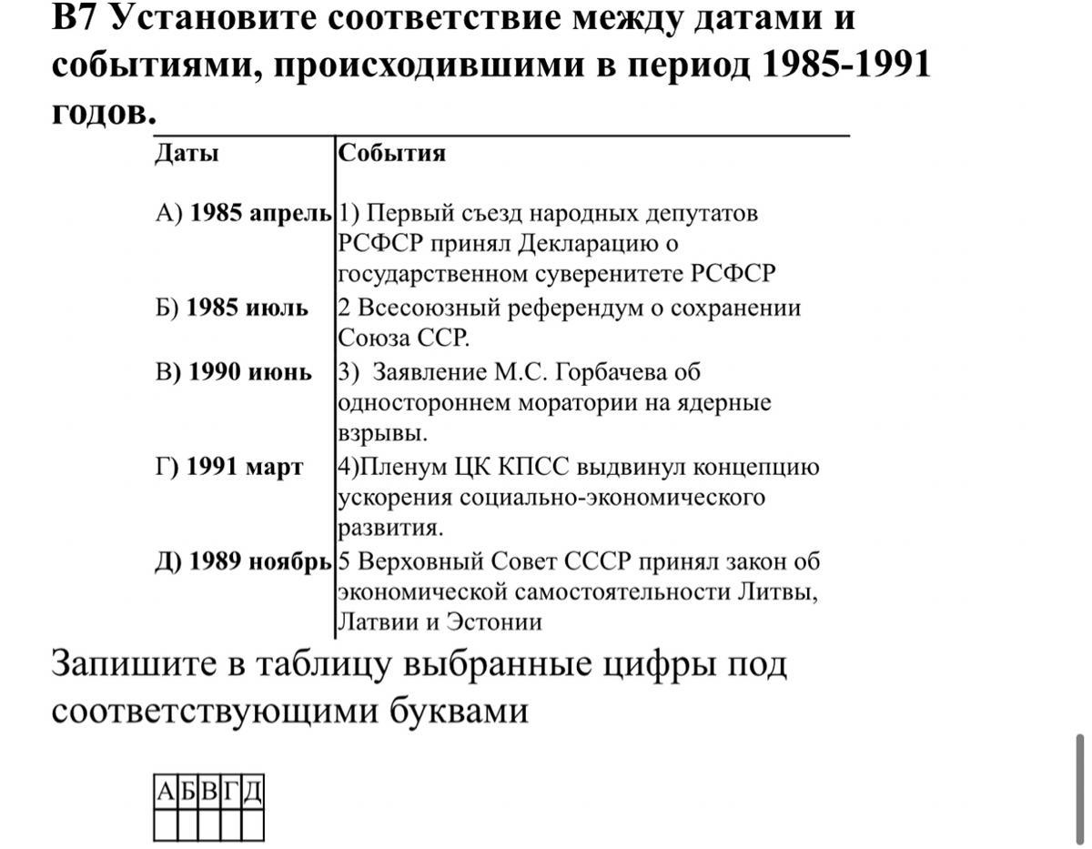 Установите соответствие между датами и событиями, происходившими в период 1985-1991 годов.