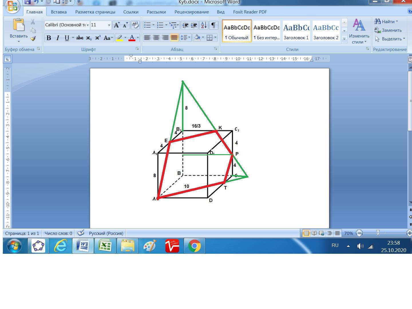 постройте сечение куба abcda1b1c1d1 плоскостью проходящей через середины ребер а1в1 и сс1 и вершину а. найдите периметр полученного сечения, если длина ребра куба равна 8 см
