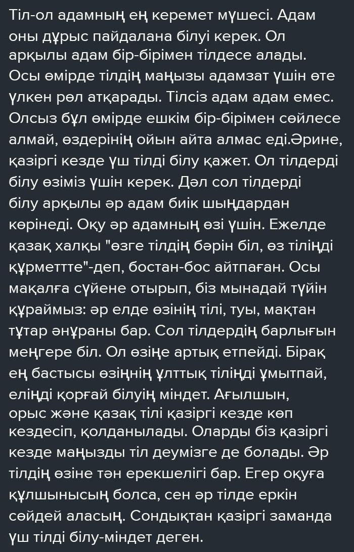 «Қазіргі заманда үш тілді білу-міндет»деген пікірмен келісесіз бе? Келісу,келіспеу себептерін көрсетіп,100 сөзден тұратын эссе жазыңыз. Жазба жұмысында көмекші есімдерді қолданыңыз.