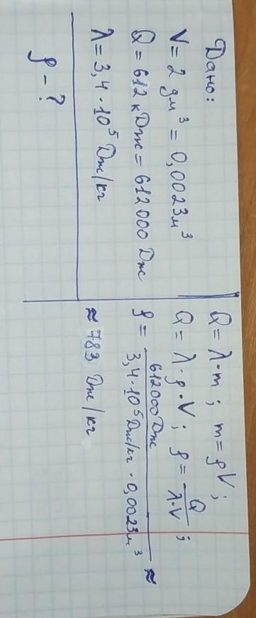 Для плавления 2,3 дм³ льда необхдимо 612 кДж теплоты. Определи плотность льда, если его начальная температура равна 0 °С.