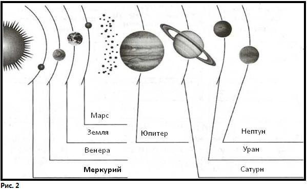 первые четыре слева,снизу вверх:Меркурий,Венера,Земля,Марс