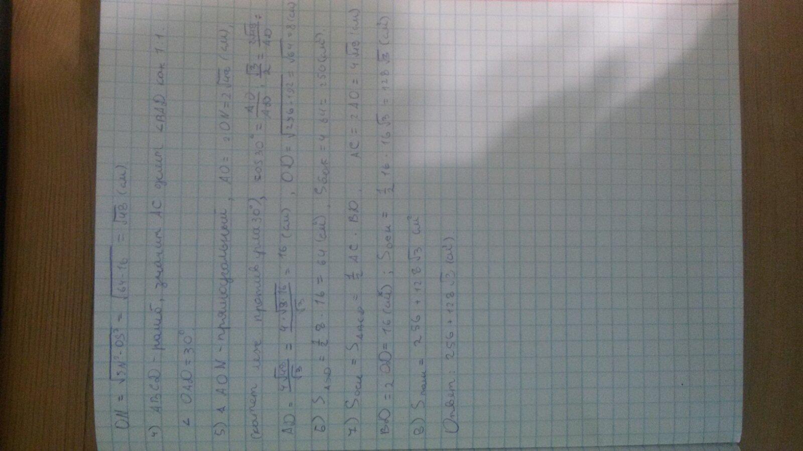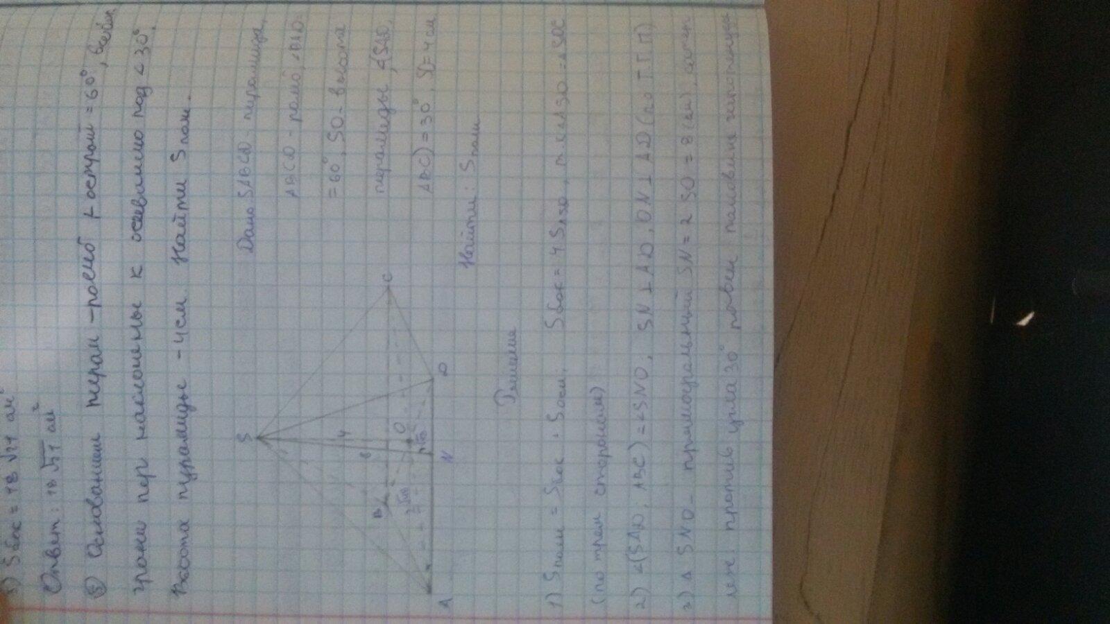 Основанием пирамиды является ромб с острым углом 60°, все боковые грани пирамиды наклонены к основанию под углом 30°. Высота пирамиды равна 4 см. Найдите площадь полной поверхности данной пирамиды.