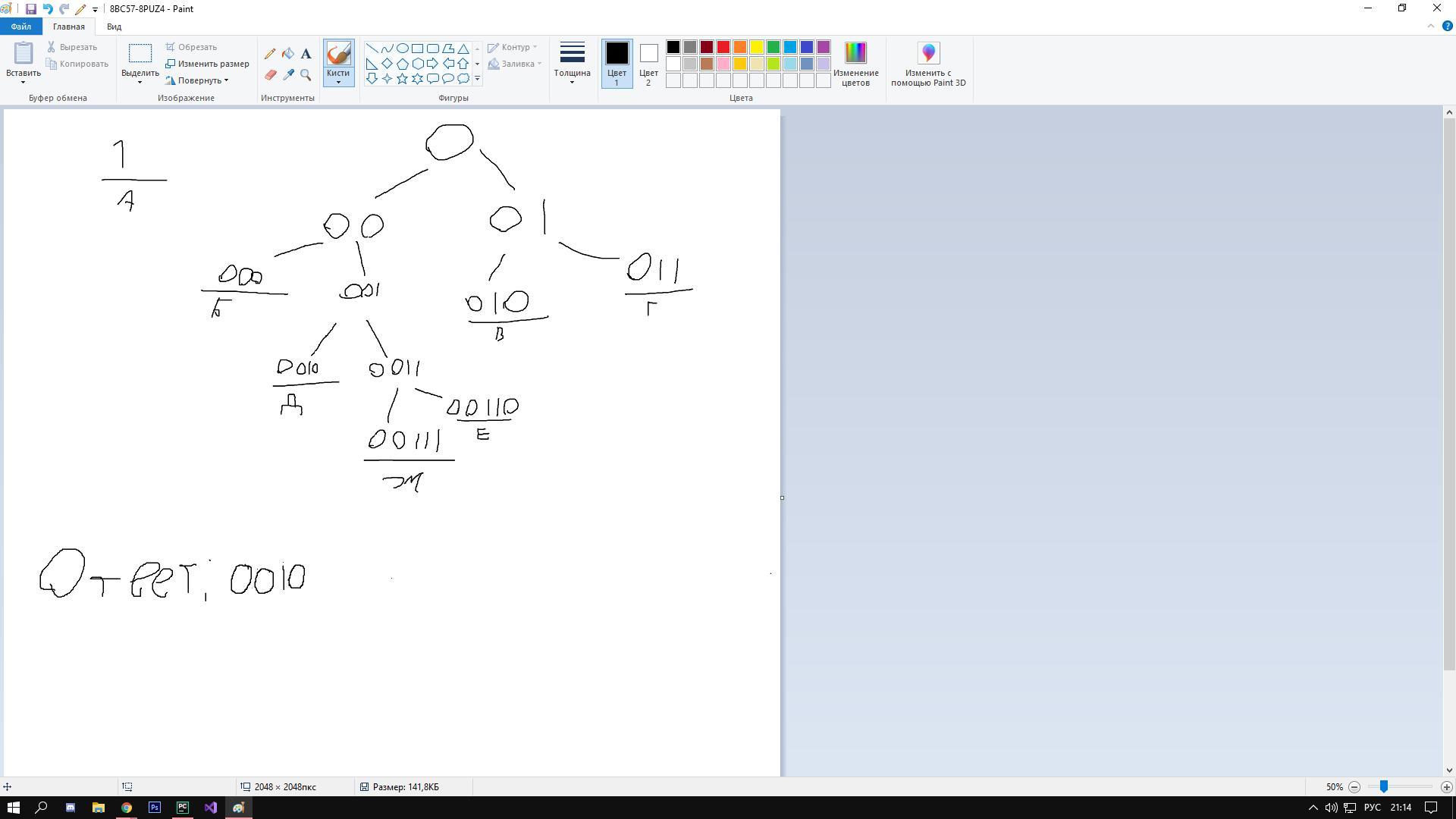 1.Для кодирования некоторой последовательности, состоящей из букв А, Б, В, Г, Д, Е, Ж решили использовать неравномерный двоичный код, удовлетворяющий условию Фано. Для букв А, Б, В, Г использовали соответственно кодовые слова 000, 1, 010, 011. Укажите кратчайшее возможное кодовое слово для буквы Д, при котором код будет допускать однозначное декодирование. Если таких кодов несколько, укажите код с наименьшим числовым значением.