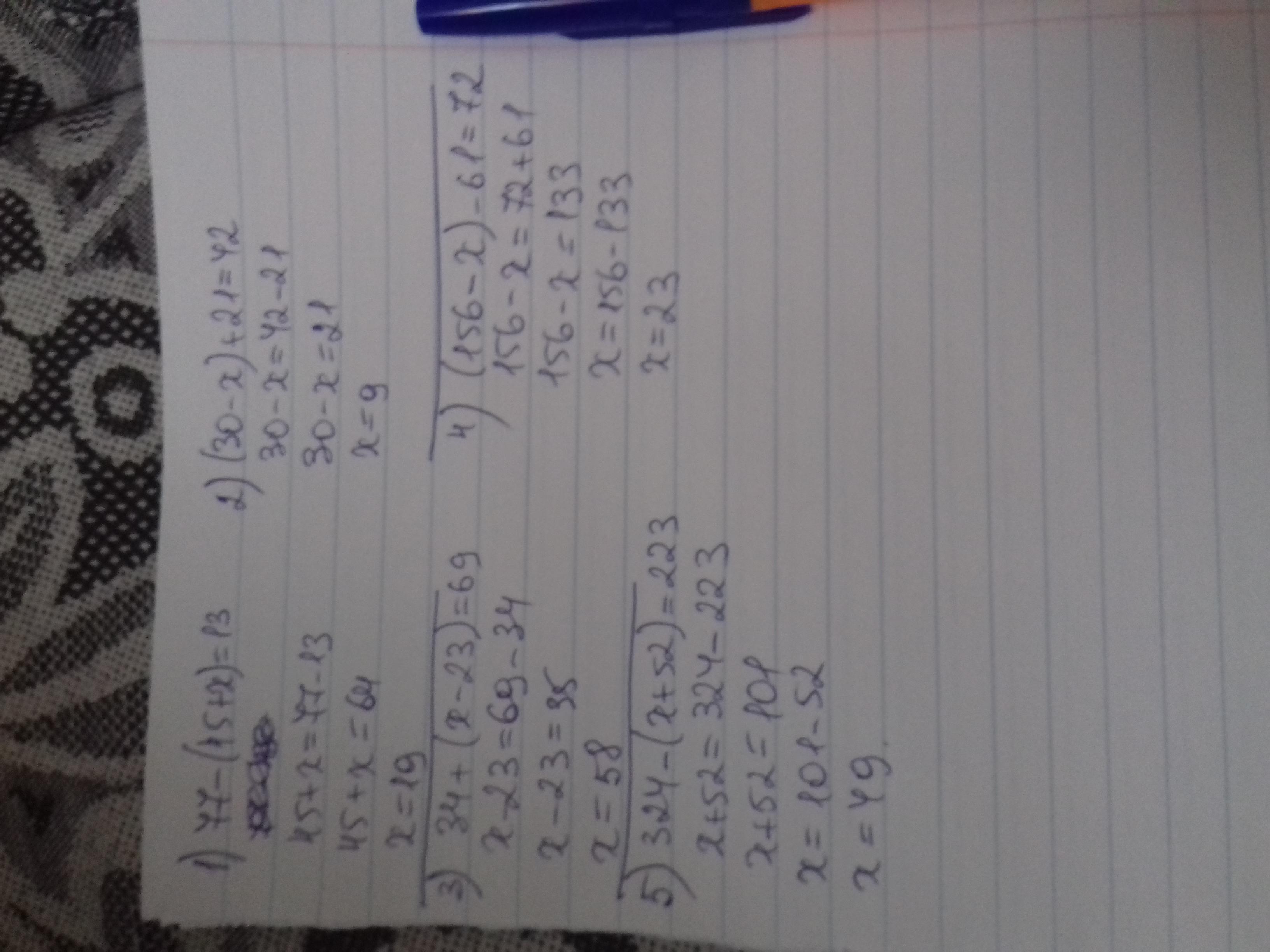 1)77-(45+x)=13. 2)(30-x)+21=42