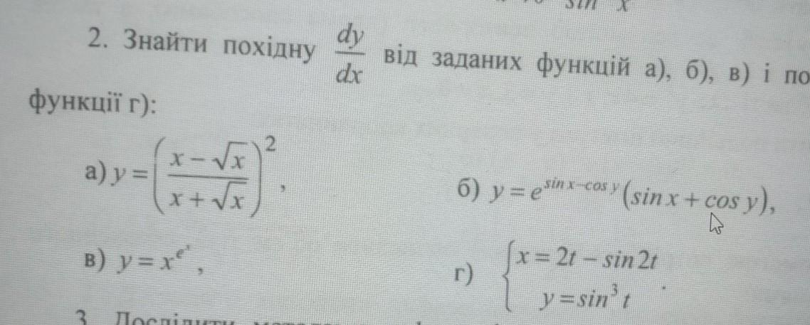 знайти похідну dy/dx від заданих функцій а), б), в) і похідну d^2y/dx^2 від функції г):