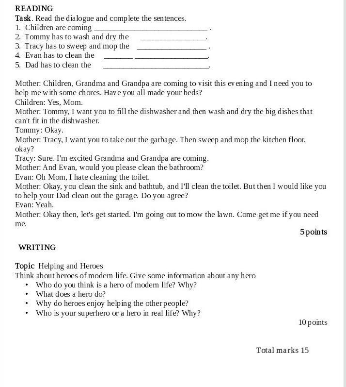 1.Children coming to visit this evening 2.Tommy has to wash and dry the the big dishes 3.Tracy has to sweep and mop the kitchen floor 4.Evan has to clean the bathroom 5.Dad has to clean the garage