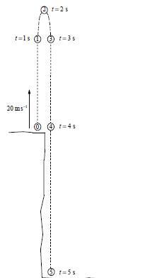 С обрыва бросили камень вертикально вверх со скоростью 20 м/с. В конце движения он упал на дно обрыва. На рисунке 1 показана диаграмма, на которой кружочками отмечены положение камня через интервал времени равный 1 с. Сопротивление воздуха не учитывать. Считать, что ускорение свободного падения равно 10 м/с2. Определите, в каких положениях проекция вектора скорости тела будет положительна, отрицательна, либо равна нулю: