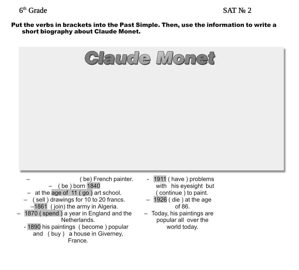 Put the verbs in brackets into the Past Simple. Then, use the information to write a short biography about Claude Monet.