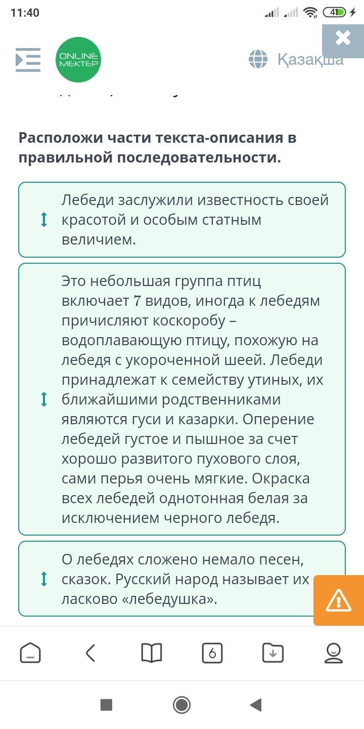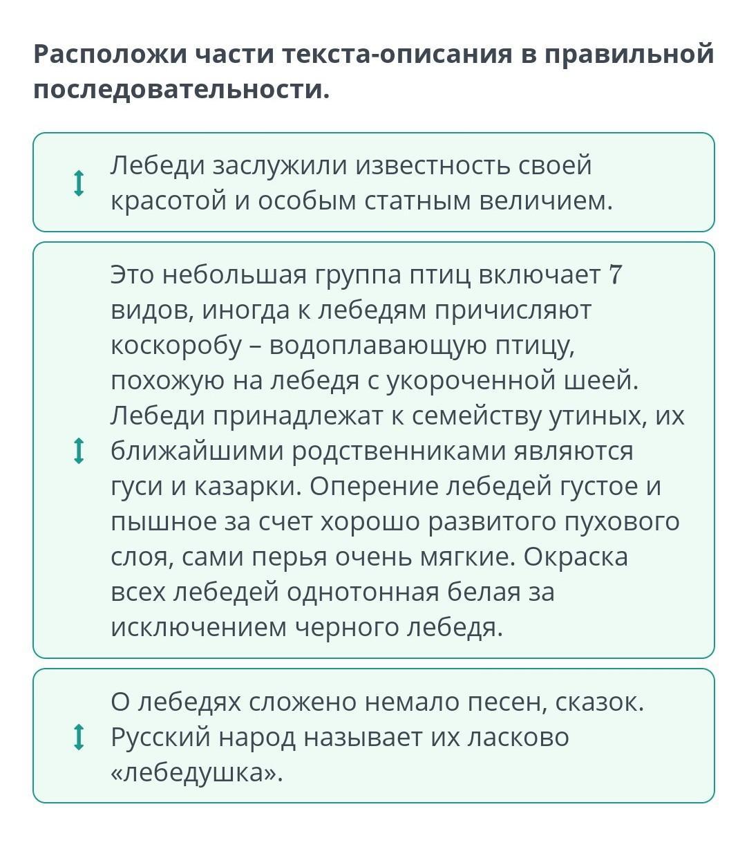 Расположи части текста-описания в правильной последовательности. Лебеди заслужили известность своей красотой и особым статным величием. О лебедях сложено немало песен, сказок. Русский народ называет их ласково «лебедушка». Это небольшая группа птиц включает 7 видов, иногда к лебедям причисляют коскоробу – водоплавающую птицу, похожую на лебедя с укороченной шеей. Лебеди принадлежат к семейству утиных, их ближайшими родственниками являются гуси и казарки. Оперение лебедей густое и пышное за счет хорошо развитого пухового слоя, сами перья очень мягкие. Окраска всех лебедей однотонная белая за исключением черного лебедя.