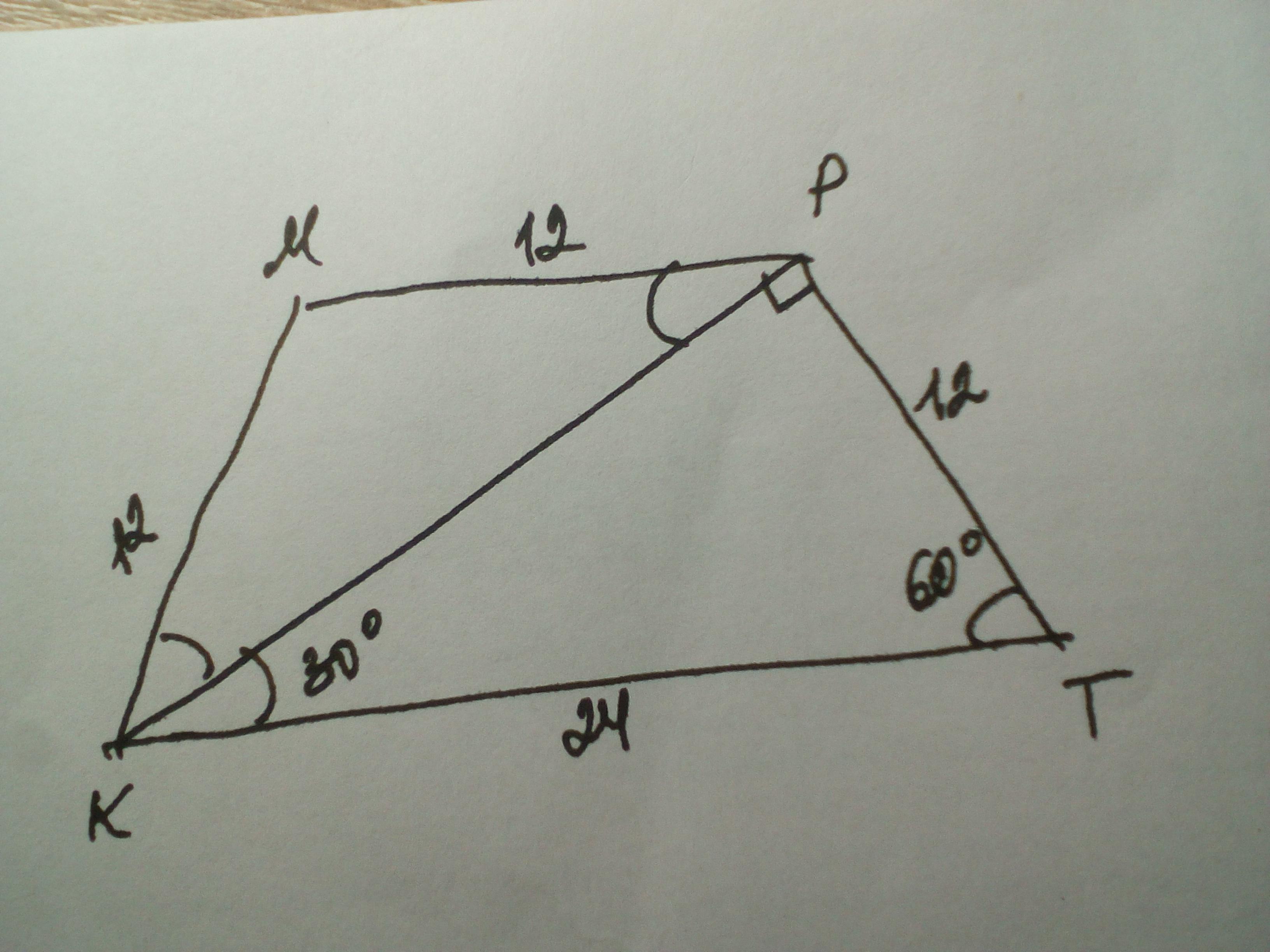 Дано: КМРТ - трапеция, КМ=РТ=12 см, ∠К=∠Т=60°. Найти МР, КТ.