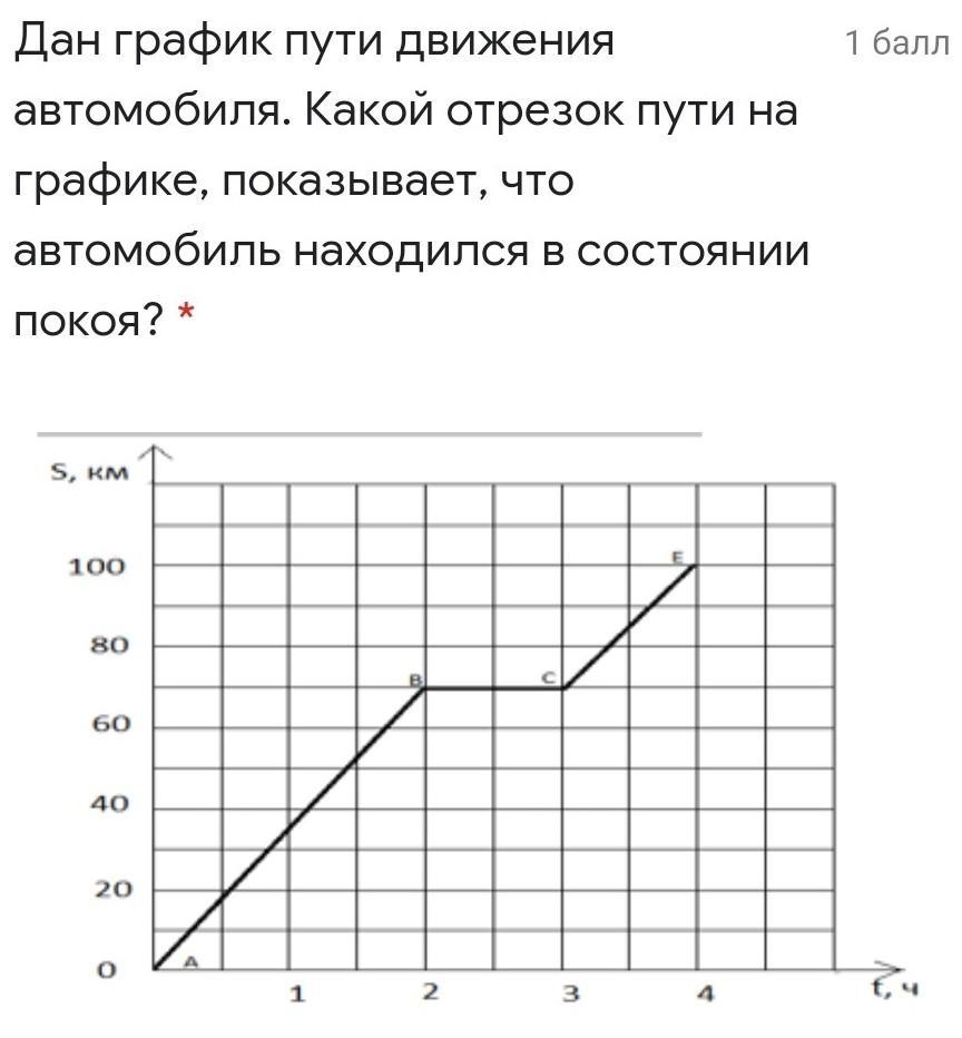 Дан график пути движения автомобиля. Какой отрезок пути на графике, показывает, что автомобиль находился в состоянии покоя? ПОМОГИТЕ ПОЖАЛУЙСТА