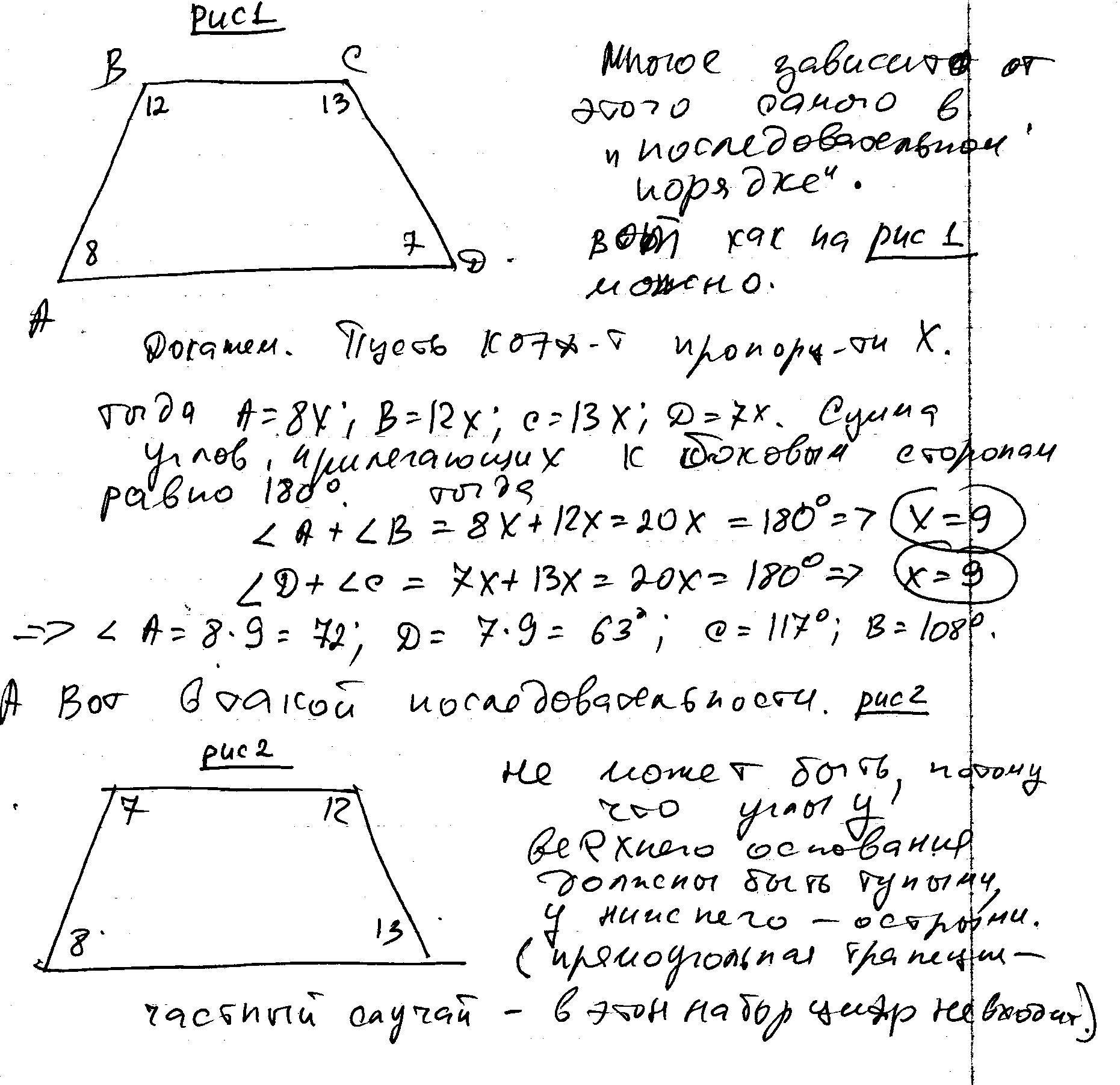 Могут ли углы трапеции,взятые в последовательном порядке,быть пропорциональны числам:8,7,13,12