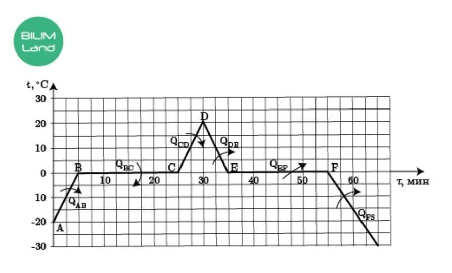 На рисунке представлен график зависимости вещества от времени и нанесены стрелки, схематически показывающие направление передачи количества теплоты. Ответы на вопросы: а) Если известно, что начальное состояние вещества твёрдое, то при температуре. °С началось плавление вещества, а при. "С кристаллизация вещества. b) Точка. соответствует началу процесса плавления, а точка началу процесса отвердевания. с) Точка соответствует окончанию процесса плавления, а точка окончанию процесса отвердевания.