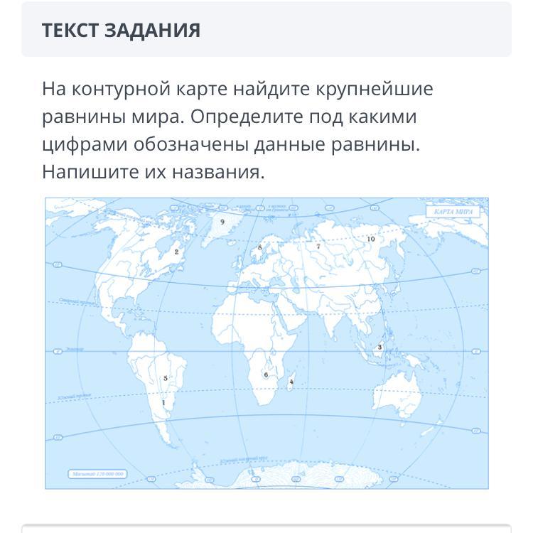 На контурной карте найдите крупнейшие равнины мира. Определите под какими цифрами обозначены данные равнины. Напишите их названия.