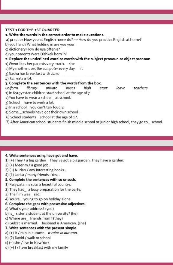 3. Complete the sentences with the wordsfrom the box. uniform private buses high start leave teachers