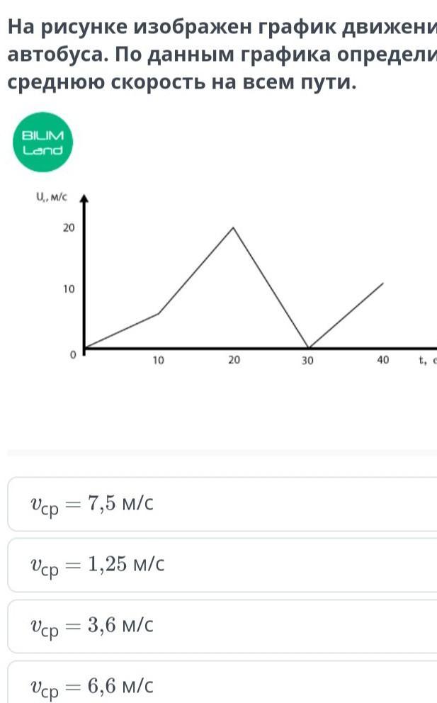 На рисунке изображен график движения автобуса. По данным графика определи среднюю скорость на всем пути.