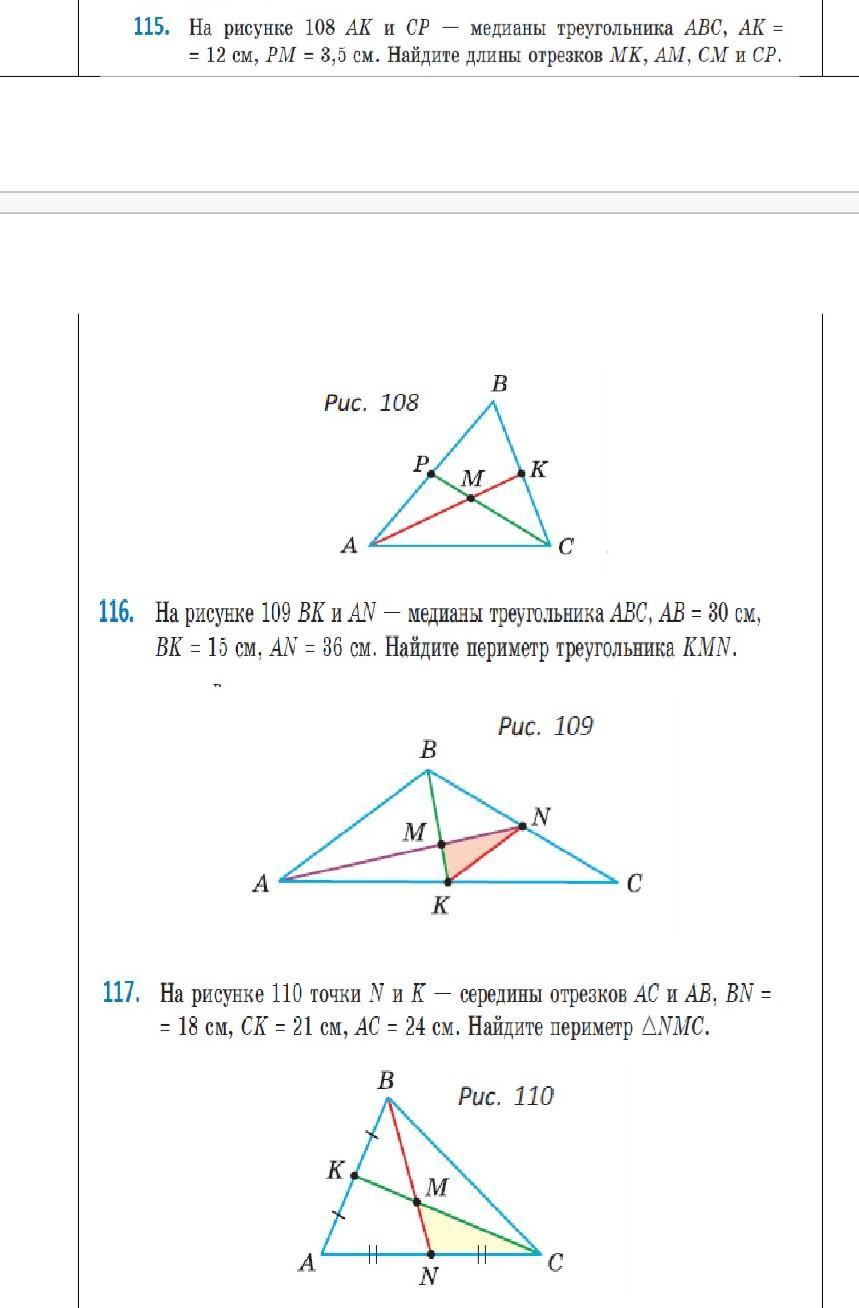 На рисунке 108 AK и CP — медианы треугольника ABC, AK = 12 см, PM = 3,5 см. Найдите длины отрезков MK, AM, CM и CP.
