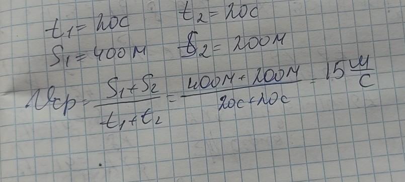 Vср = (400 + 200) / (20 + 20) = 600 / 40 = 15 м/с