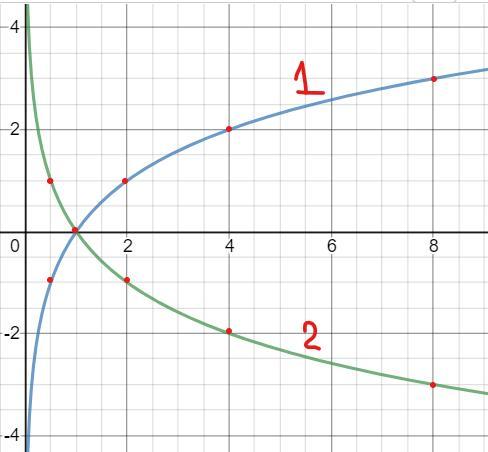 Второй график является симметричным отображением первого относительно оси Ox, так как 1/2=2⁻¹ и показатель степени -1 можно вынести, как множитель перед логарифмом.