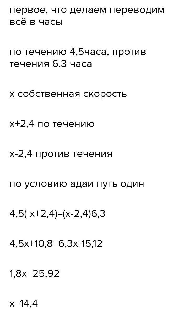 теплоход прошел по реке из пункта A в пункт В за 4 ч 30 мин, а из В в А он прошёл за 6 ч 18 мин. Определите, в какую сторону течет река, а также выясните скорость теплохода в стоячей воде, если скорость течения реки равна 2,4км/ч