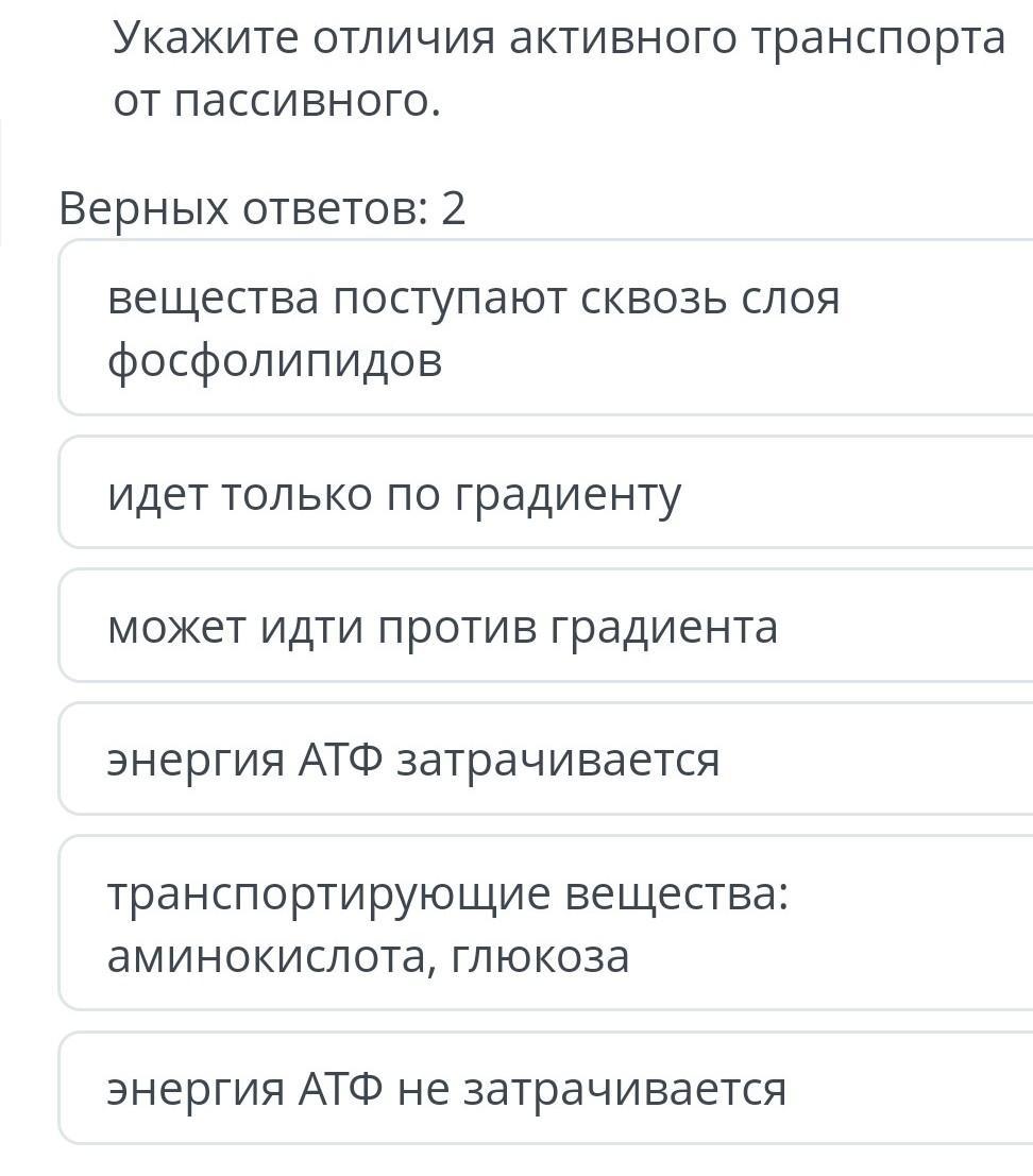 Укажите отличия активного транспорта от пассивного. Верных ответов: 2 вещества поступают сквозь слоя фосфолипидов идет только по градиенту может идти против градиента энергия АТФ затрачивается транспортирующие вещества: аминокислота, глюкоза энергия АТФ не затрачивается