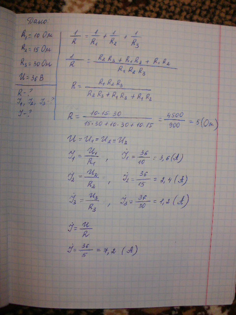 Три резистори з опорами 10,15,30 Ом з'єднані паралельно.Який опір цієї ділянки кола?Яка сила струму в кожному з резисторів і загальна сила струму ,якщо до цієї ділянки кола прикладено напругу 36 В.