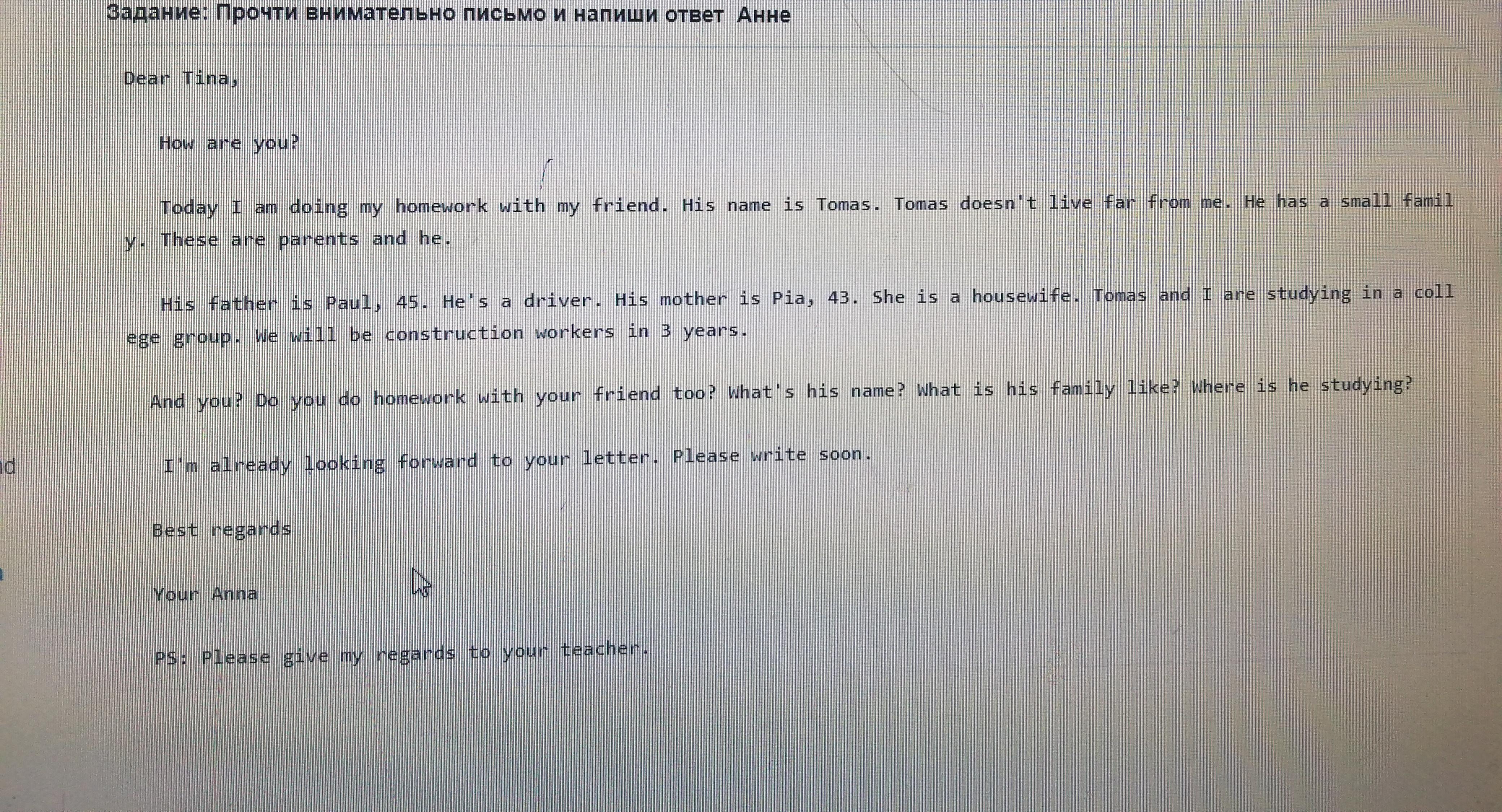 About me, I'm doing my homework myself, without any friend, because all my classmates and most of all friends are silly, and i don't like it. I want to do my homework with you, Anna. My family is like father works in a condom factory, mother works as a saleswoman in a stall.