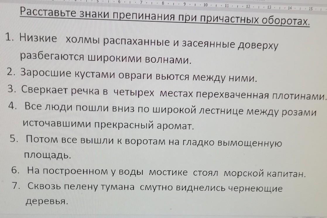 Пояснение : в предложениях 2,5,6,7 определяемое слово стоит после причастного оборота, так что запятые не ставятся.