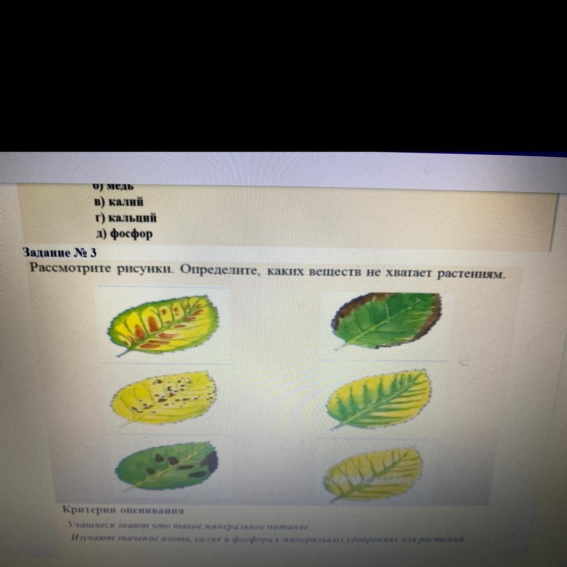 Рассмотрите рисунки. Определите, каких веществ не хватает растениям.