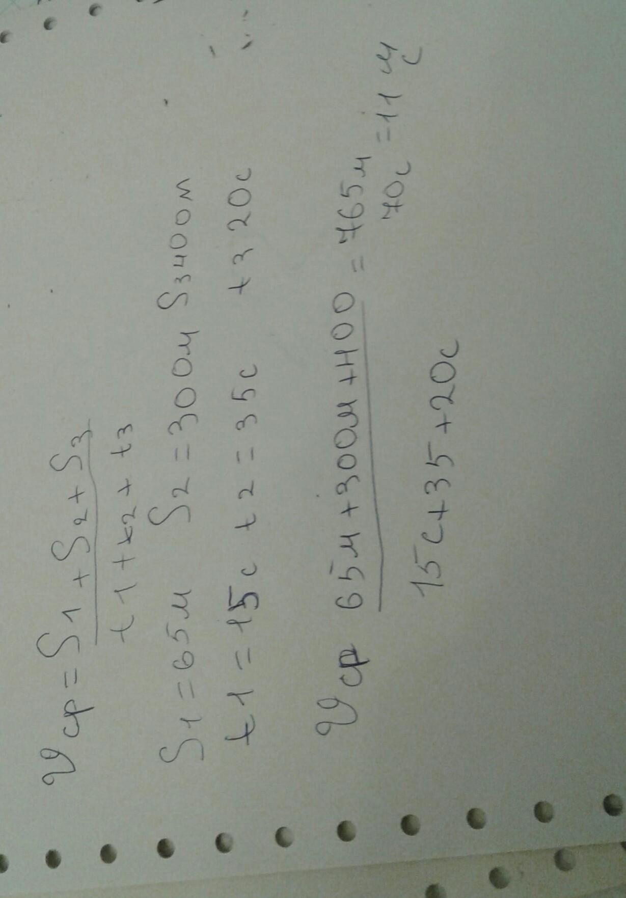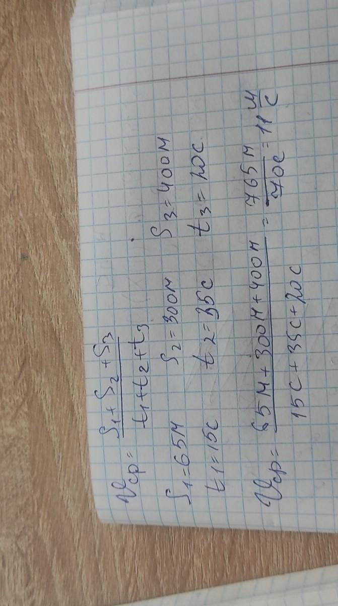 Велосипедист за первые 15 с проехал 65 м, за следующие 35 с – 300 м и за последние 20 с – 400 м. Найдите среднюю скорость велосипедиста на всем пути. Даю 100 баллов!!!