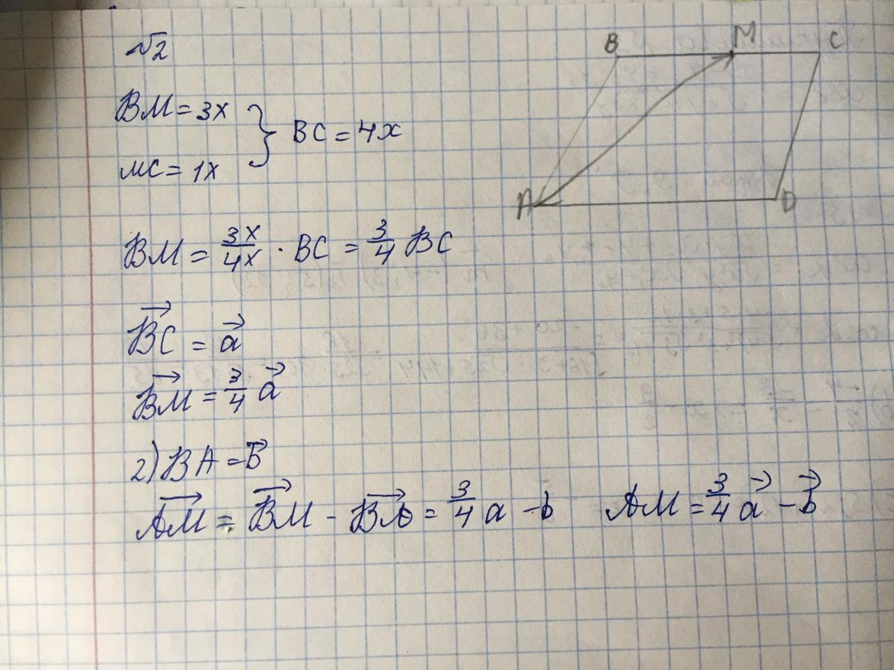 Точка М лежит на стороне ВС параллелограмма ABCD, причем ВМ:МС=3:1. Выразите векторы AM через векторы ВС=а ВА=а