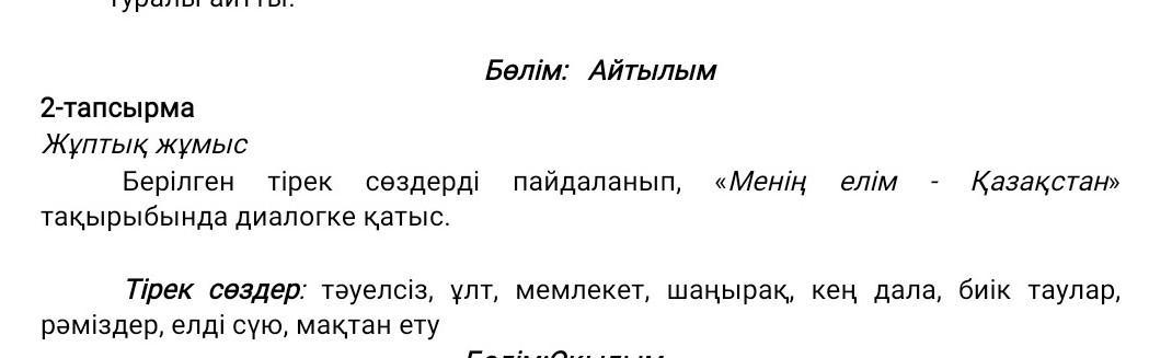 Нужно с помощью ключевых слов составить диалог на тему Моя страна - Казахстан