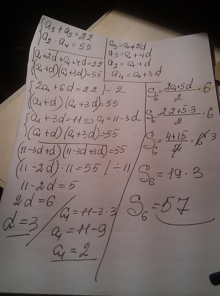 Сумма третьего и пятого членов арифметической прогрессии равна 22, а произведение четвертого и шестого членов - 55. Найдите сумму первых шести членов прогрессии.