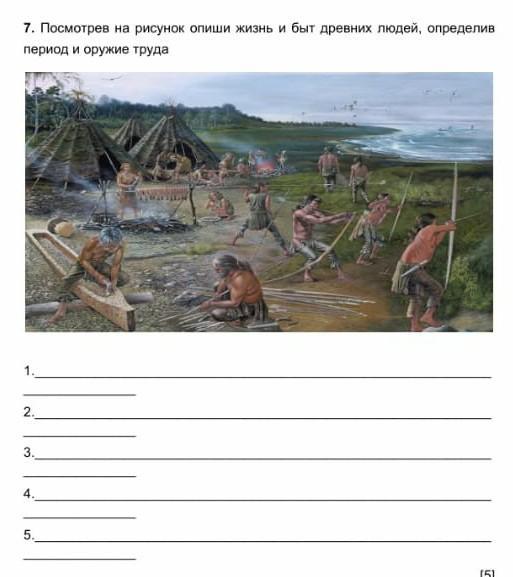 7. Посмотрев на рисунок опиши жизнь и быт древних людей, определив период и оружие