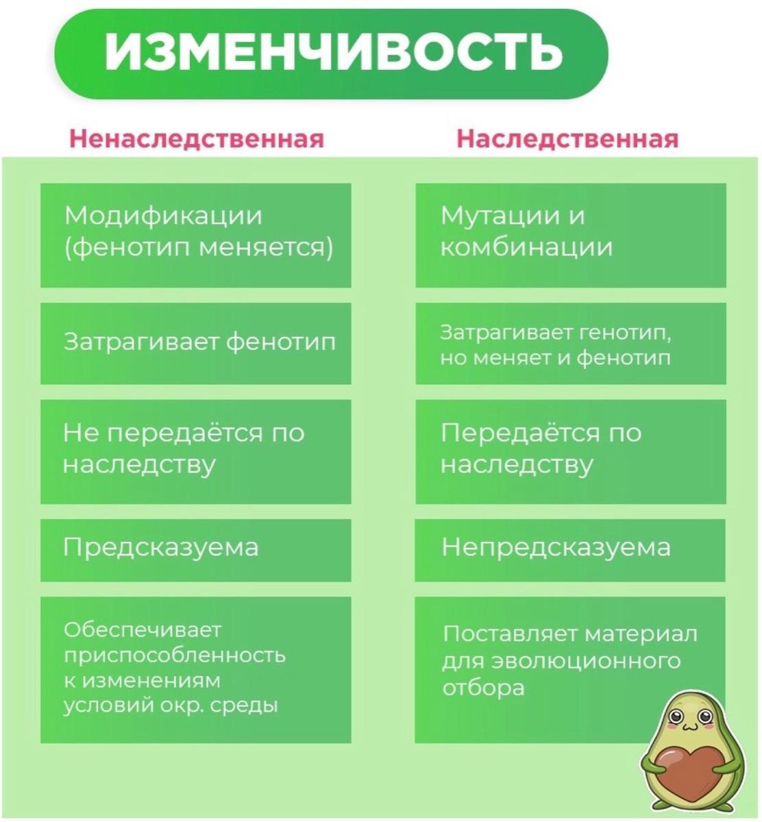 Наследственная изменчивость делится на мутационную и комбинативную. Изменяется генотип (число хромосом, последовательность нуклеотидов и т.д.). Наследственная изменчивость носит ненаправленный и индивидуальный характер (у каждого организма случайным образом могут возникать случайные мутации), она передаётся потомкам.