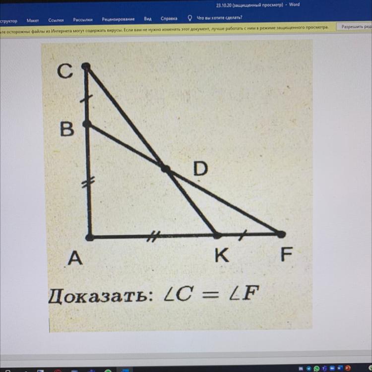 Треугольники CAK и BAF подобны по углу и двум сторонам между ними угол A общий ,и стороны BA=AK по условию, и стороны CA=AF по условию. Так как треугольники подобны , значит соответственные углы равны поэтому углы C и F равны