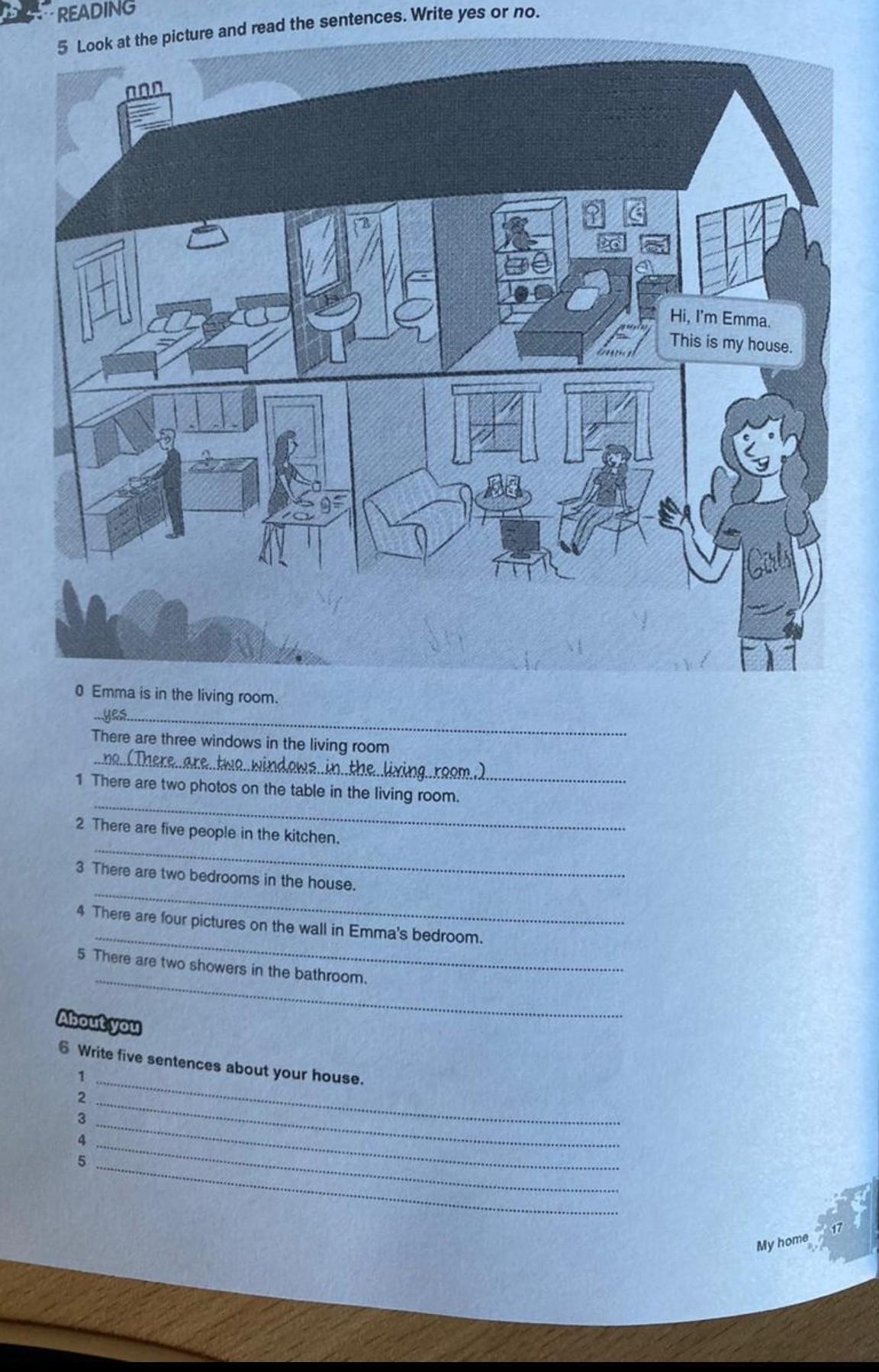 yes, no (there are two people's in the kitchen), yes, no (there are four pictures on the wall), no (there's one shower in the bedroom)