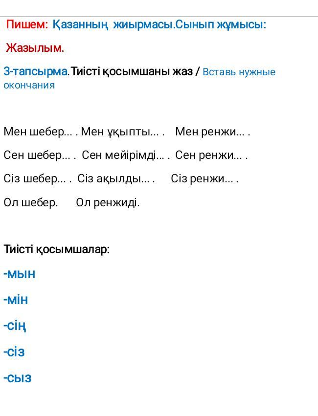 1.мін,2.мын,3.мін,4.сің,5.сің,6.сің,7.сіз,8.сыз,9.сіз
