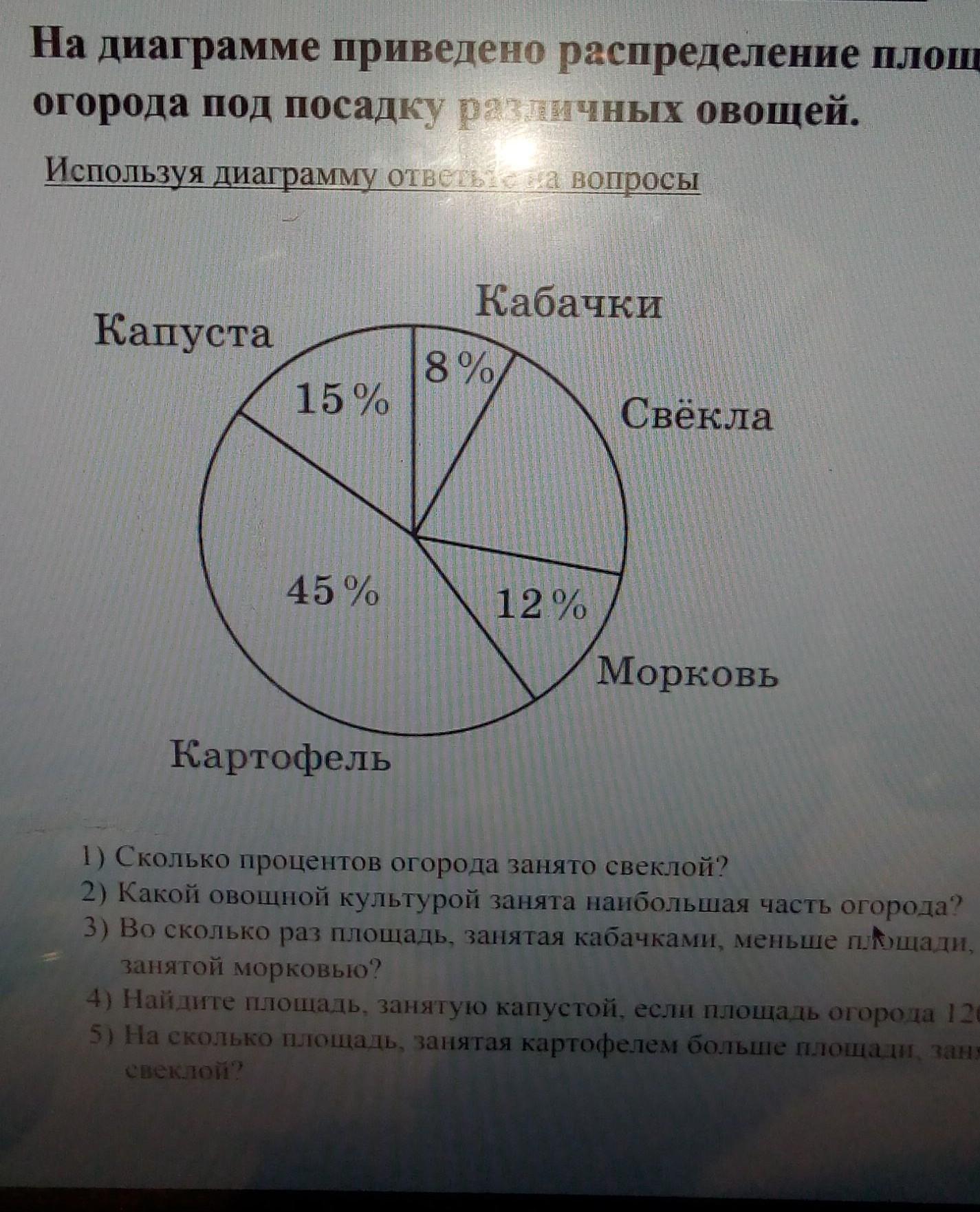 4) Найдите площадь, занятую капустой, если площадь огорода 1200 м.