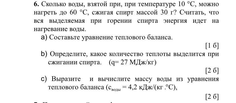 c) m(воды) = Q(сгорания спирта)/c*(t2-t1) = 810000 Дж / 4200 Дж/(кг* С) * (60 С -10 С)=3,85714 кг