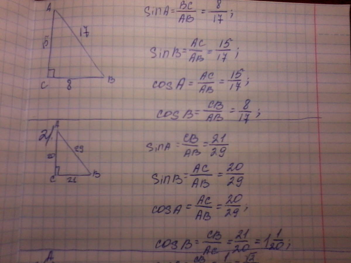 найдите синус и косинус острых углов A и B треугольника с прямым углом С, если