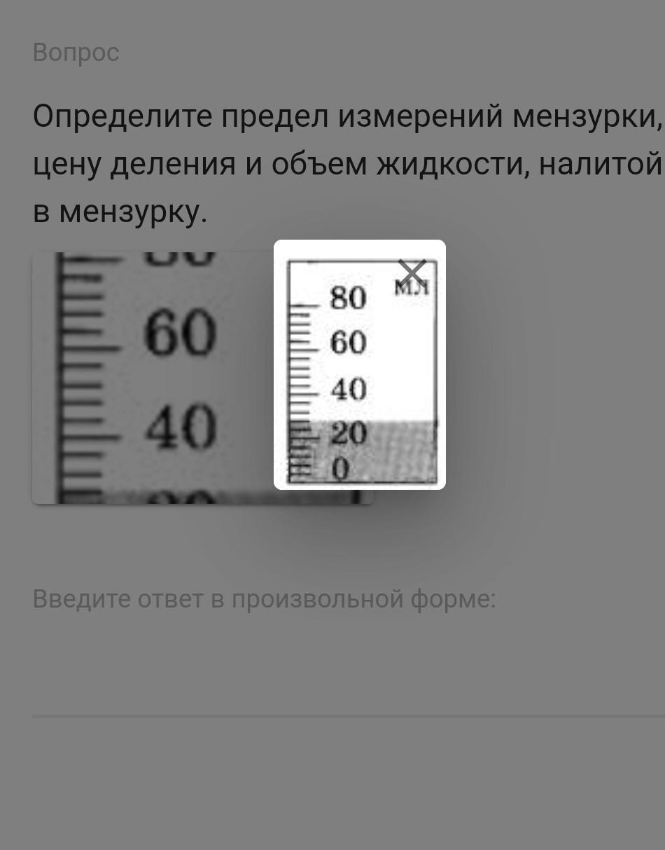 Определите предел измерений мензурки, цену деления и объем жидкости, налитой в мензурку.