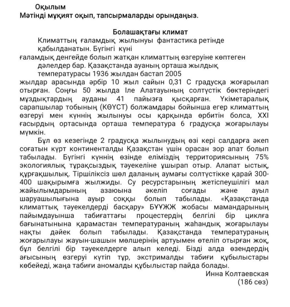 мәтінде коршаган ортанын ластануынан климаттын озгеріп жатканы және климат озгеруі аркылы турли кубылыстардын жиі болатыны туралы айтылган